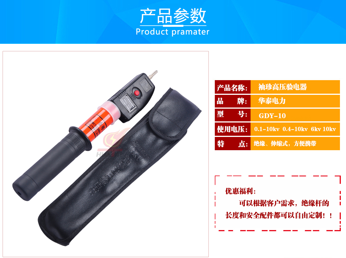 石家莊華泰電力工具有限公司公司生產(chǎn)GDY-II型聲光驗(yàn)電器,分為0.1kV至500kV七個電壓等級產(chǎn)品,驗(yàn)電時它即發(fā)出聲和光雙重報(bào)警信號,以提示工作人員被檢線路或設(shè)備帶電。供用戶按實(shí)際運(yùn)行電壓等級選擇訂貨。