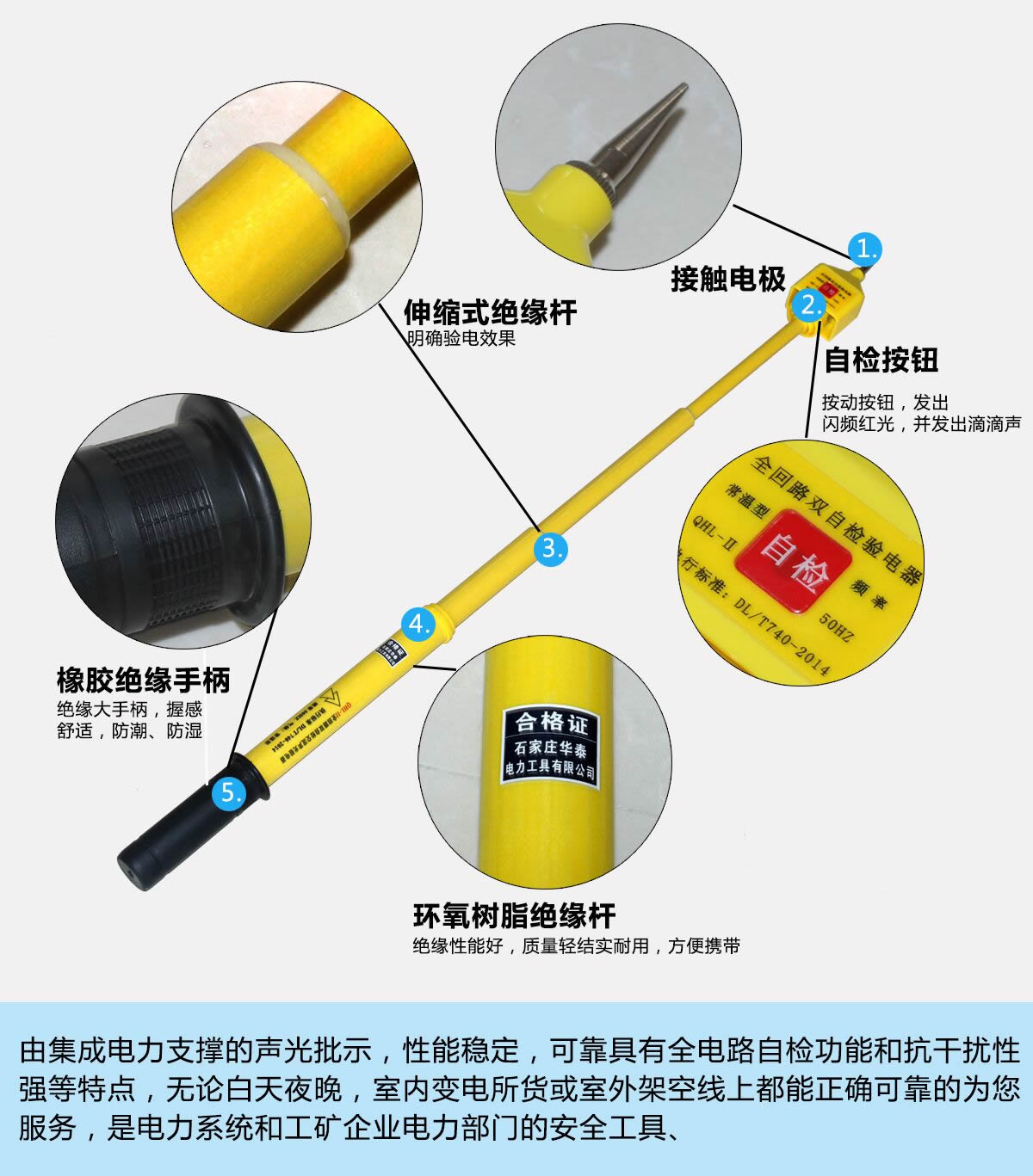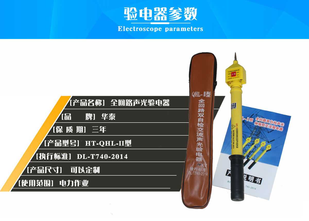 全回路雙自檢交流聲光驗(yàn)電器是我公司采用國(guó)際先進(jìn)技術(shù)和我們雄厚的技術(shù)力量以及多年來(lái)的制造研究所生產(chǎn)的一款新型交流驗(yàn)電器,它具有靈敏度高,不受強(qiáng)電場(chǎng)干擾,具有全回路自檢功能,安全系數(shù)高,整體采用閉合電路設(shè)計(jì),外殼用注塑ABS工程塑料一次成型,桿體延續(xù)棒狀伸縮環(huán)氧樹(shù)脂絕緣桿,耐壓等級(jí)及安全系數(shù)比傳統(tǒng)驗(yàn)電器提高3倍。