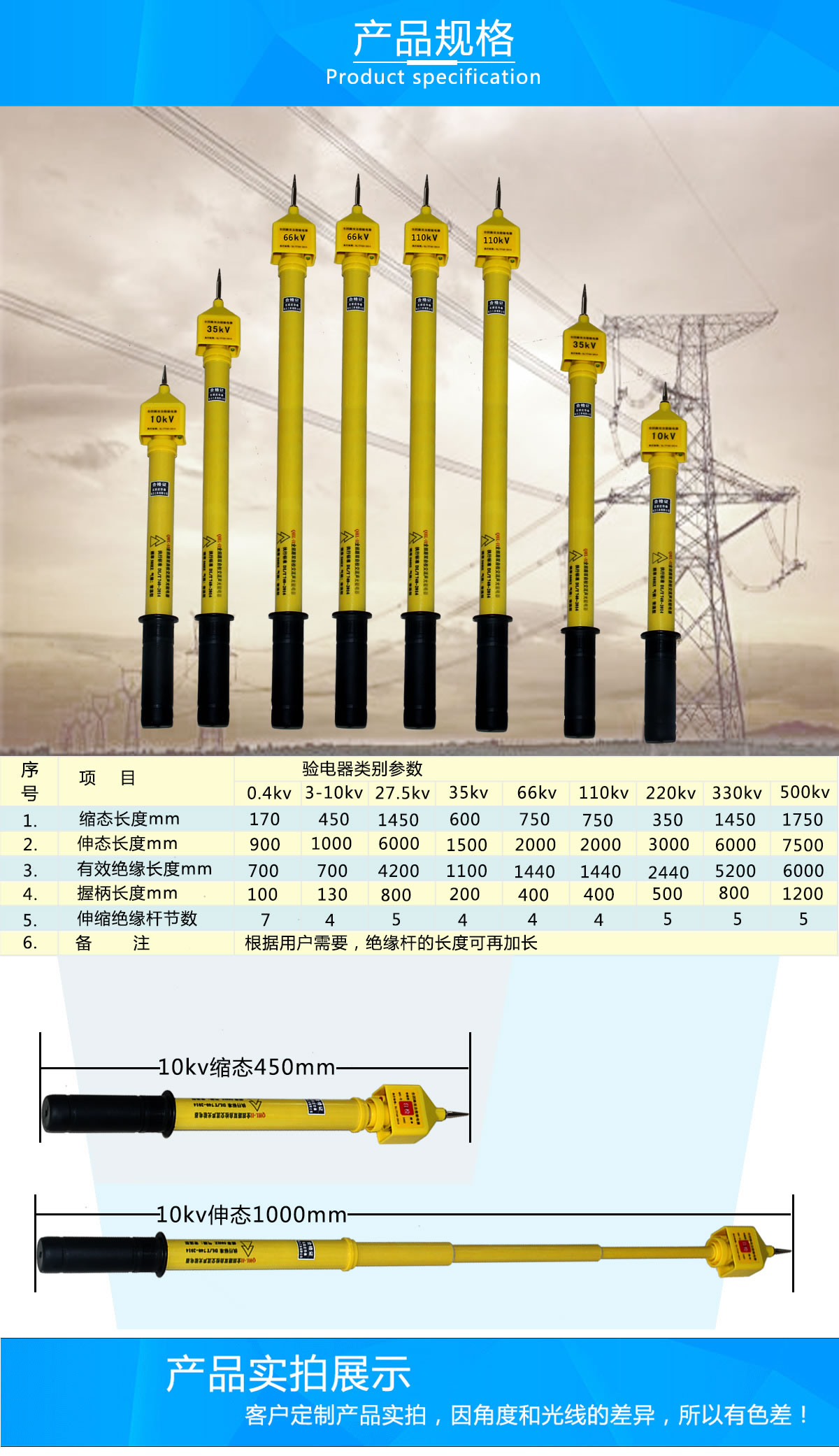 直流驗(yàn)電器 750V、1000V、1500V 根據(jù)客戶需要,絕緣桿可再加長(zhǎng)。