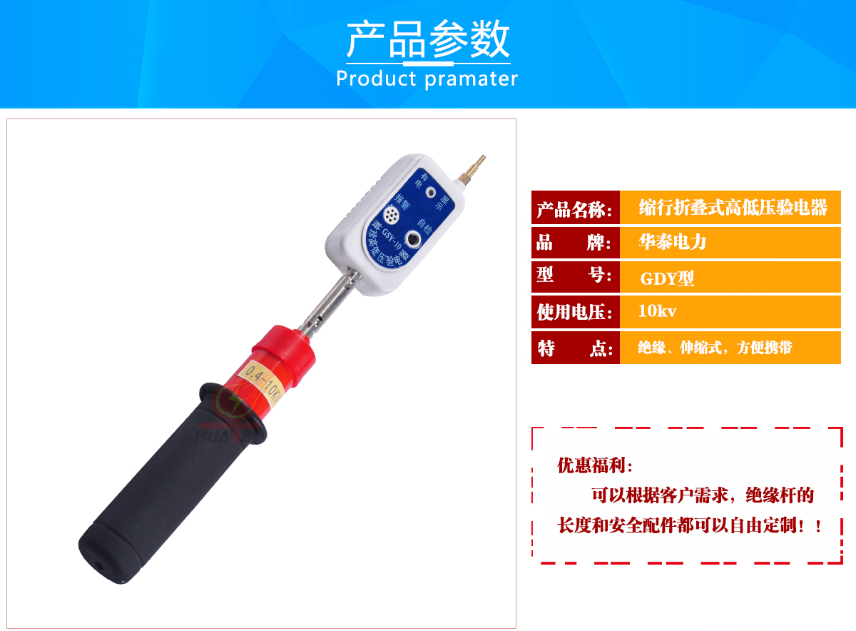 折疊式高壓驗電器是電力系統(tǒng)及工礦企業(yè)用電作業(yè)必備的安全工具,它用于檢測0.1kV-500kV線路或設備是否帶有運行工頻電壓,以確保在停電檢修的工作人員的人身安全。