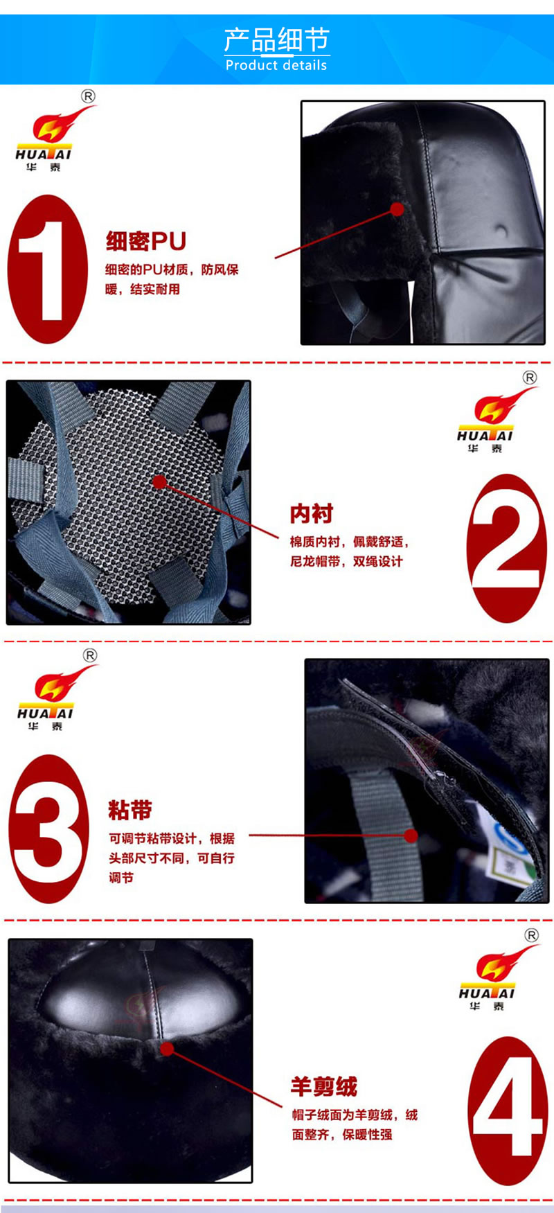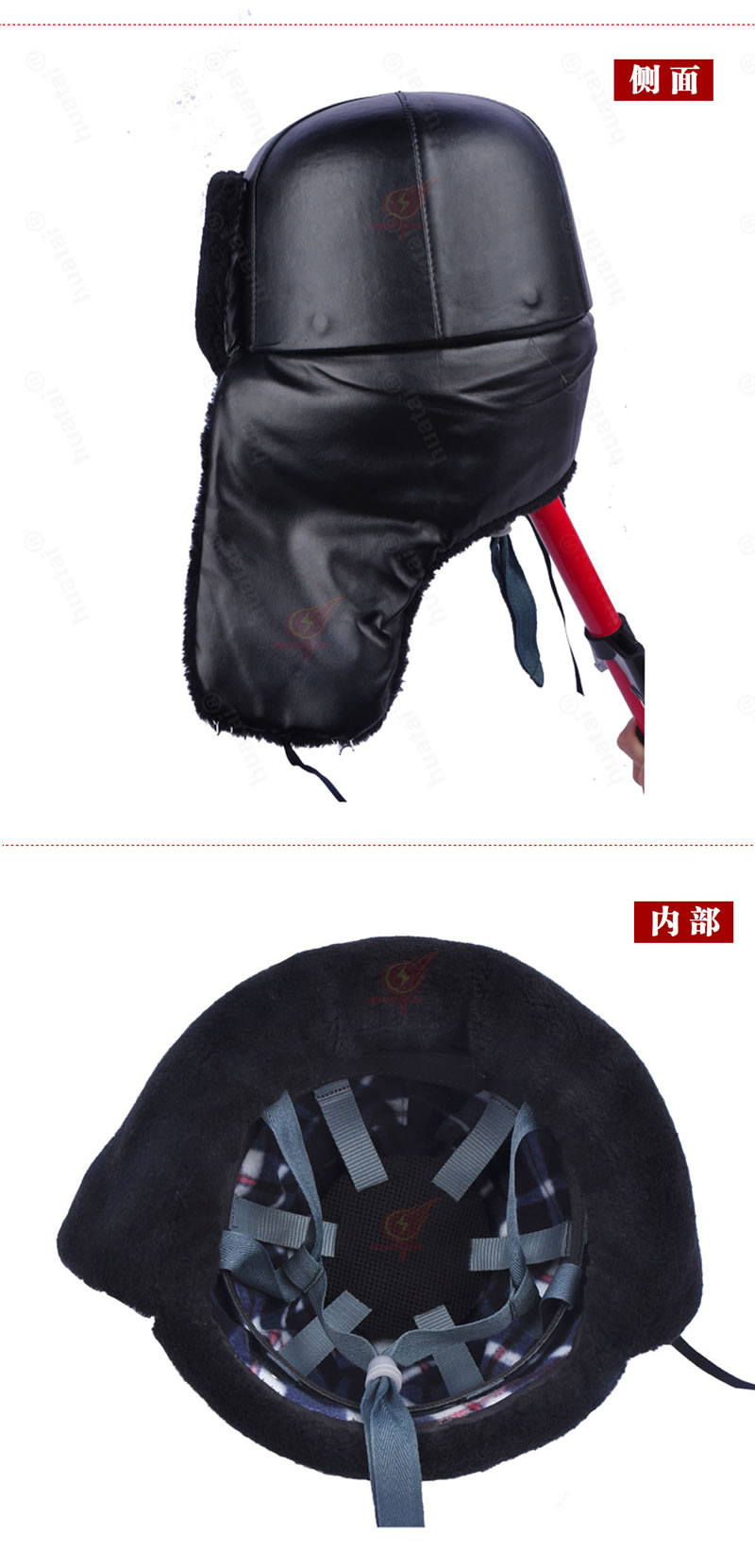 (1)外置玻璃鋼、ABS防寒安全帽:是革帽面、內(nèi)殼、保溫層與內(nèi)襯組成。其外殼采用玻璃鋼材料制成,外表層使用由皮或革帽面、毛紅絨或羊剪絨等組成。
