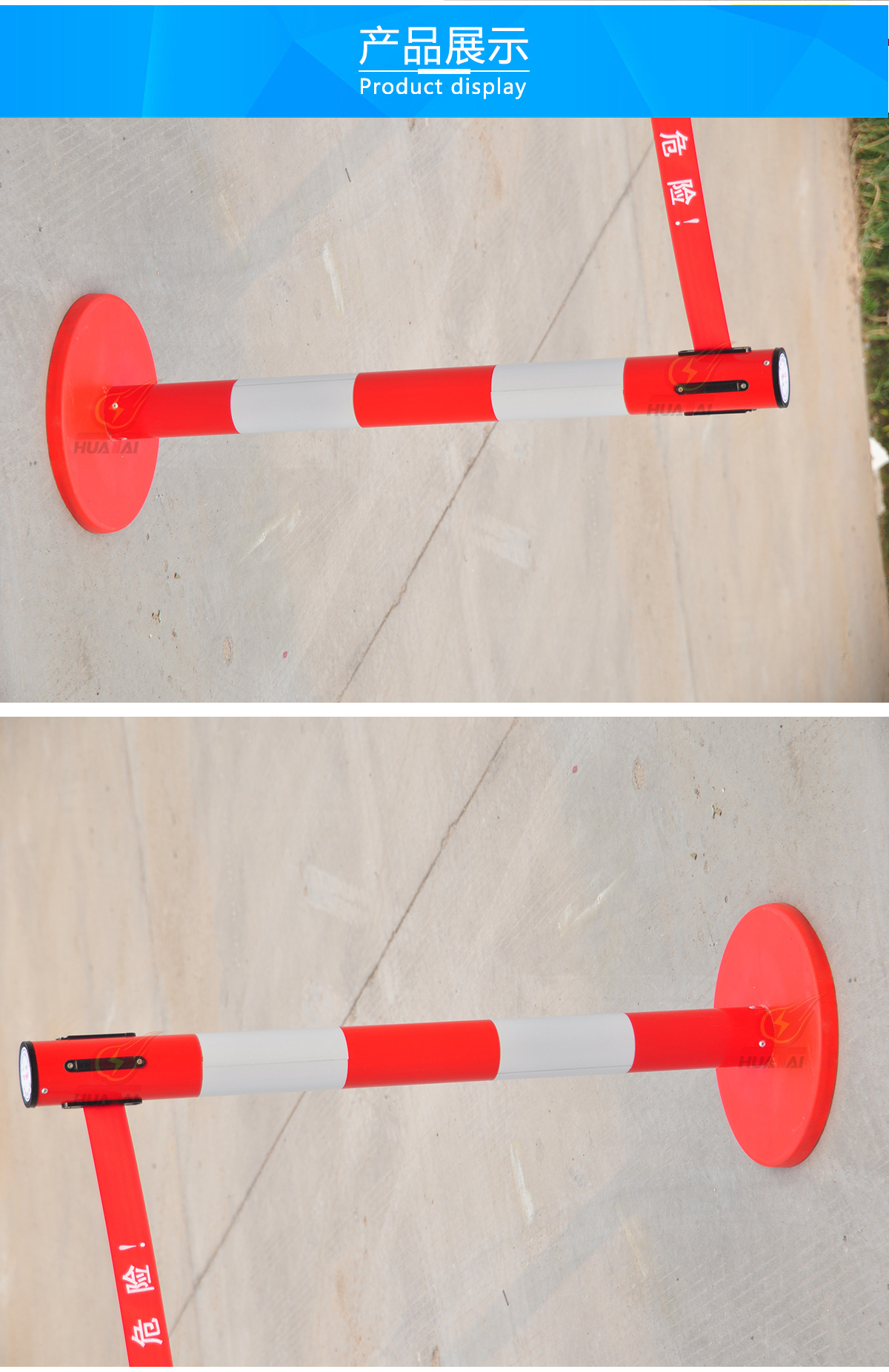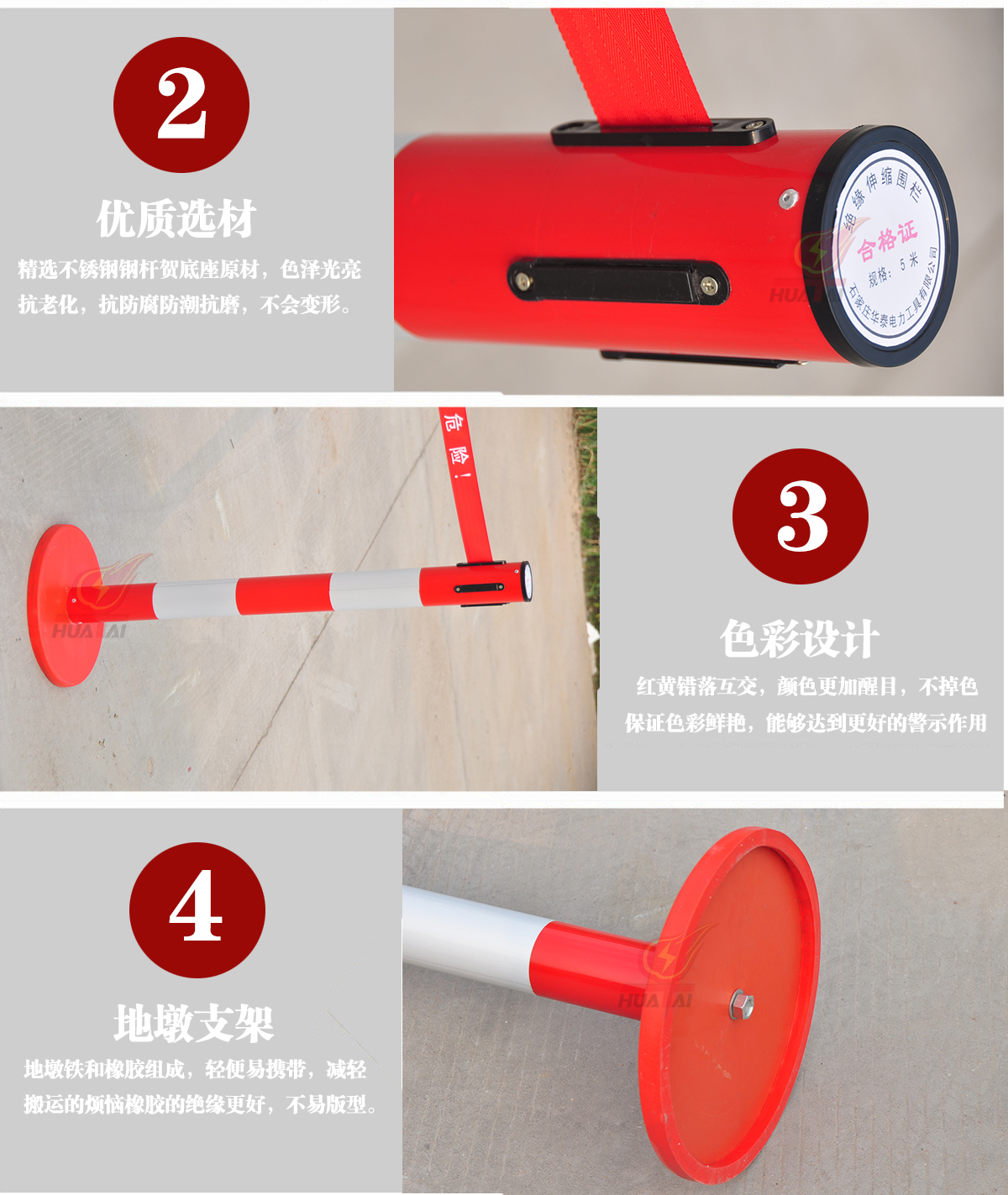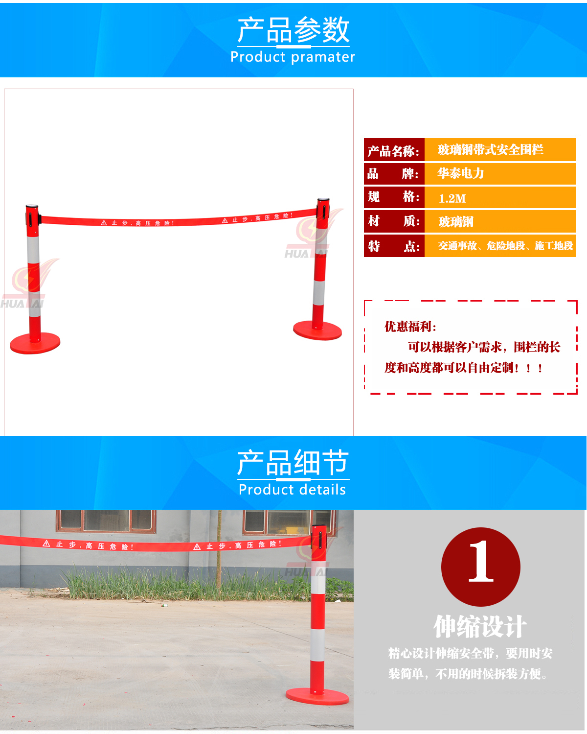玻璃鋼帶式伸縮圍欄 高度1米,筒體的直徑是76mm,筒的壁為0.8個(gè)厚,底盤(pán)是 350mm。     帶子最長(zhǎng)做到5米,帶寬5cm ??梢噪p層也可以單層帶子,兩層帶子的間距30厘米,一般是上紅下黃,紅色帶子上印 黃字(白字),黃色帶子上印紅字。這樣比較醒目。字分熒光字和普通字。 “閃電符號(hào) 止步 高壓危險(xiǎn)/危險(xiǎn)/止步 危險(xiǎn)”  等等,可以根據(jù)客戶(hù)要求定做。每根立柱上都含有帶子,四個(gè)方向都可以?huà)鞄ё?。熒光式安全警示帶圍欄,產(chǎn)品設(shè)計(jì)精美,使用靈活,隨意伸縮,隨意間距,和分割 形狀,無(wú)限連接等特點(diǎn)。