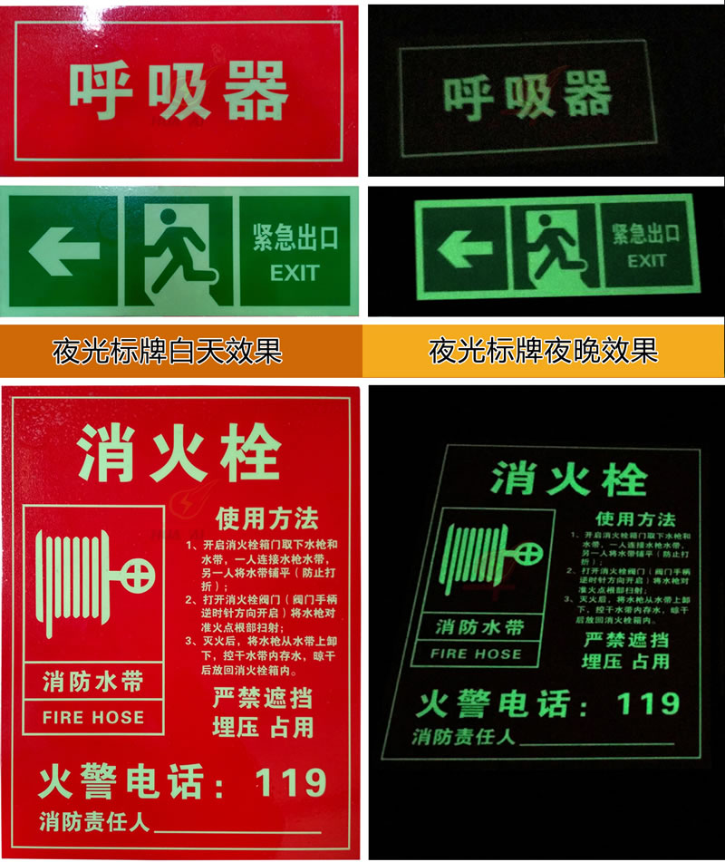 3, PVC夜光標識標牌吸光速度快,發(fā)光延續(xù)時間長,通常只需5-10分鐘可持續(xù)在暗處發(fā)光10小時以上,在消防突發(fā)事故中 起到信息指示逃生作用